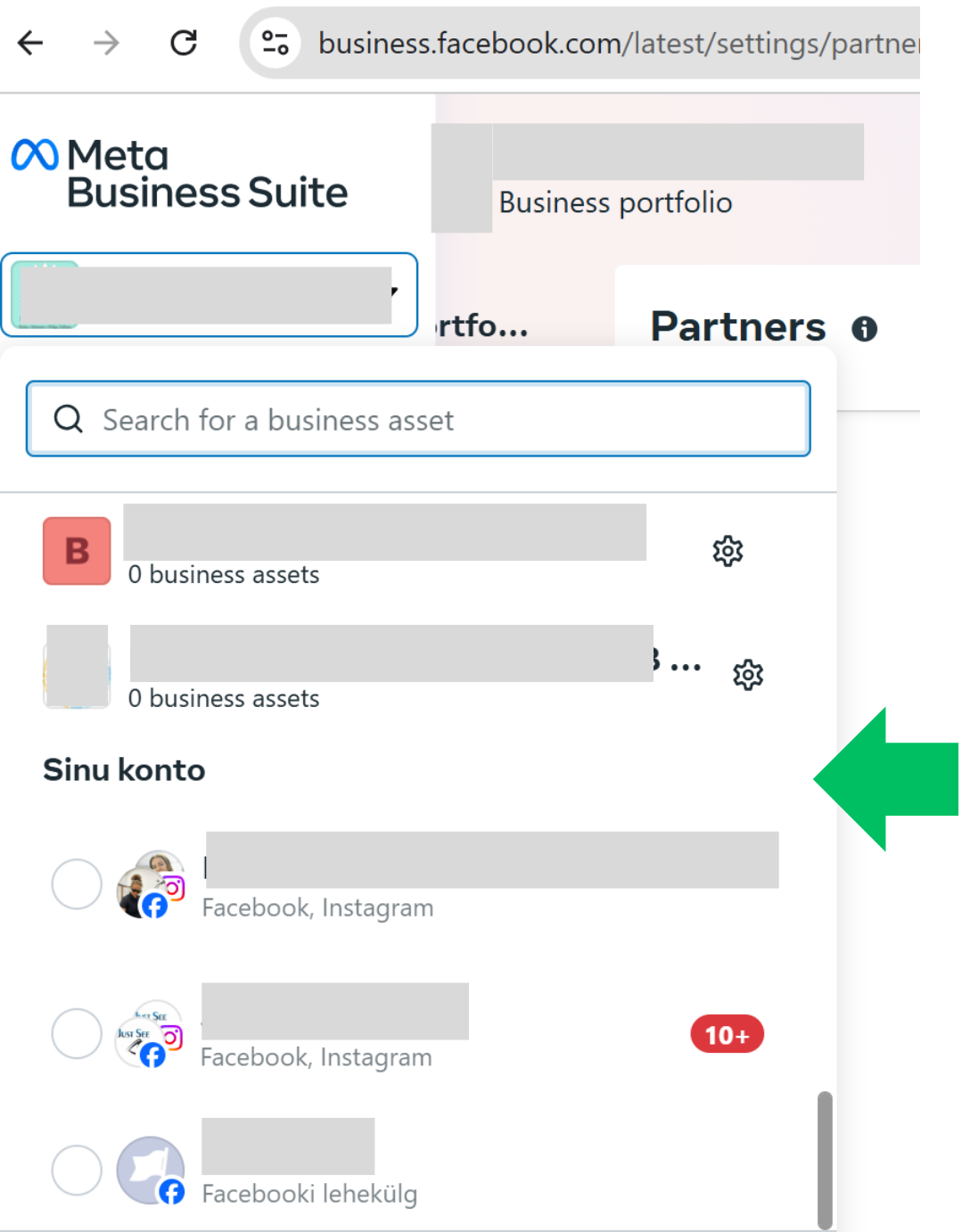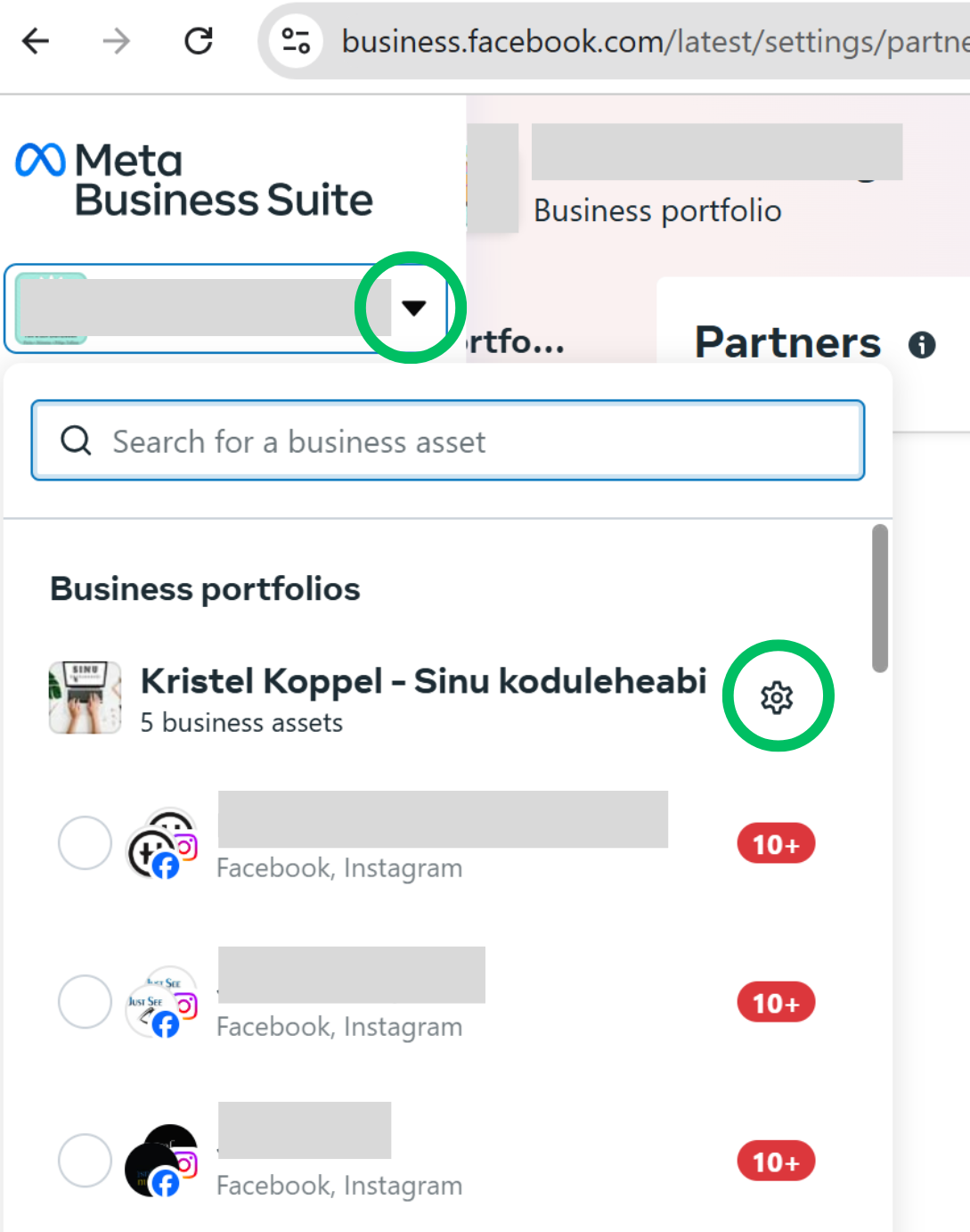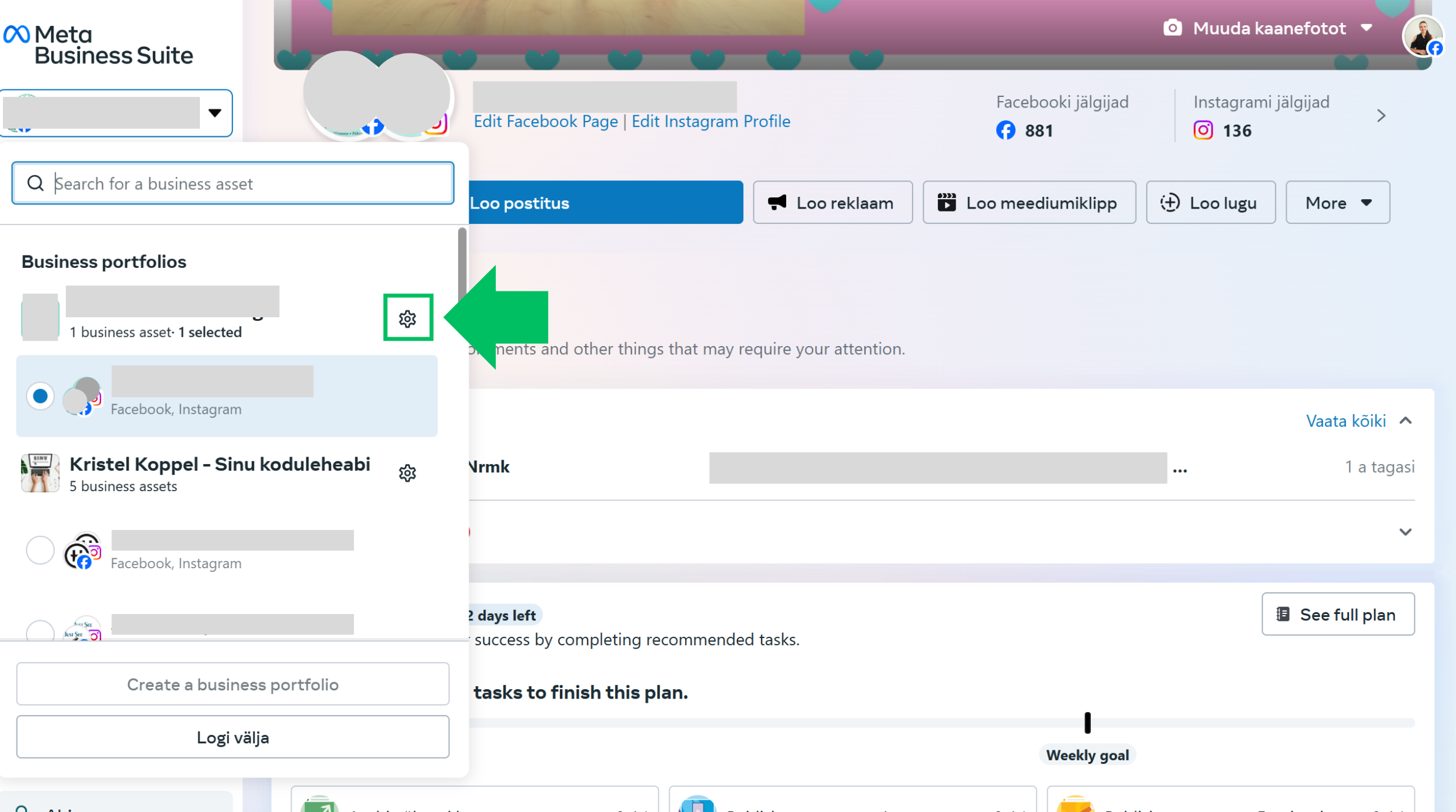 Business konto tunned ära selle järgi, et selle kõrval on hammasratta märgis ehk seaded ning selle all “assetsid”, ehk et missugused lehed selle Business konto alla kuuluvad.
