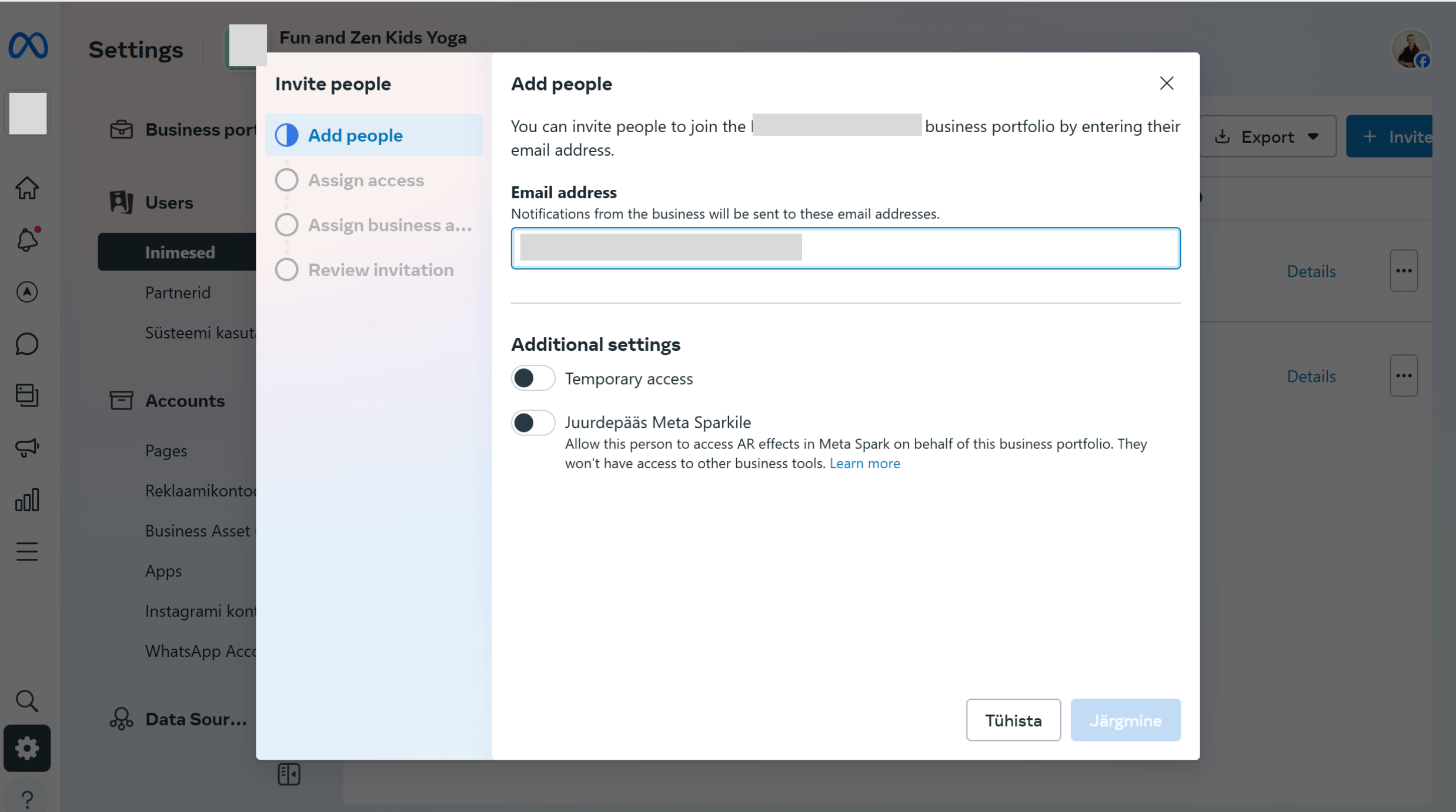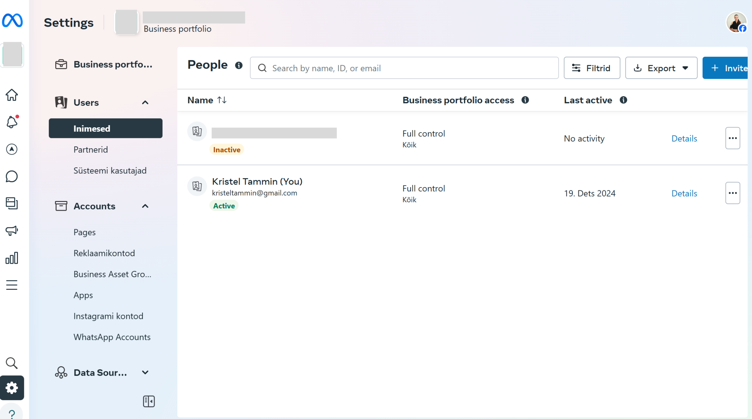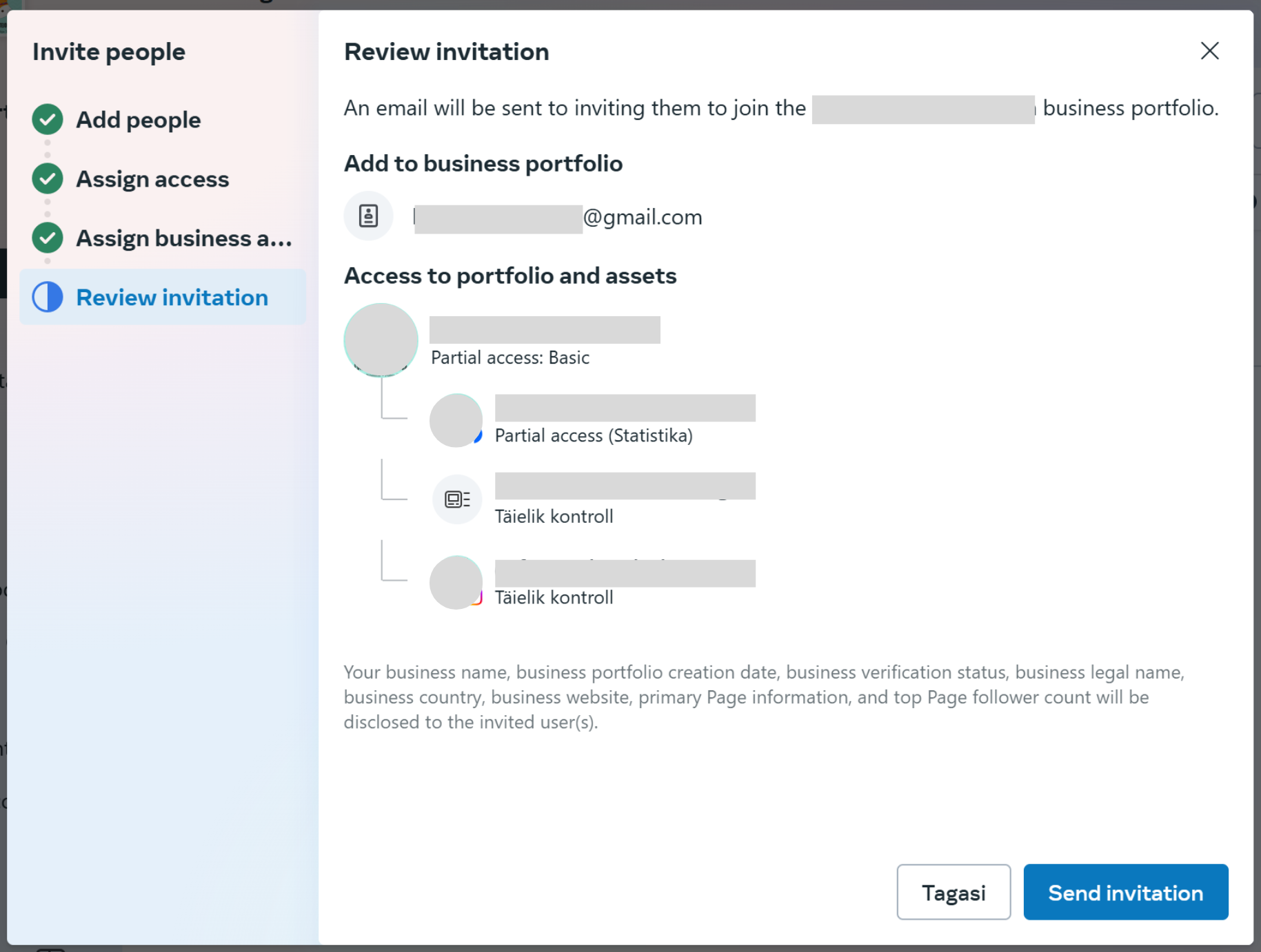 Kutse saadetakse inimese e-posti aadressile. Kui ta kutse kinnitab, saab ta määratud ligipääsu sinu Business kontole.