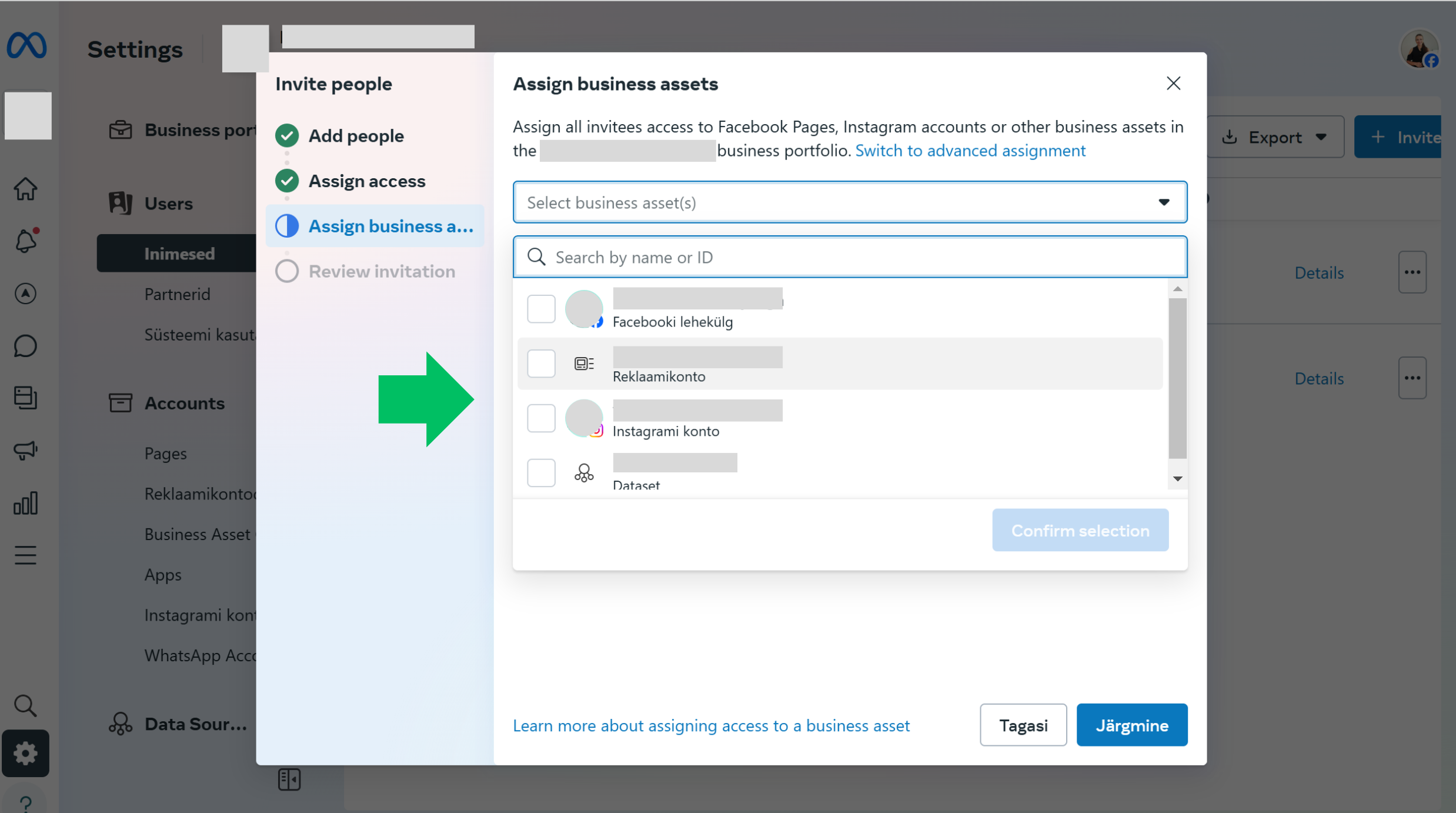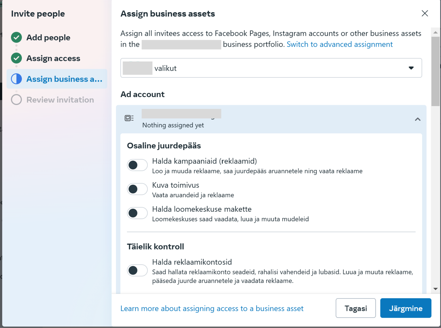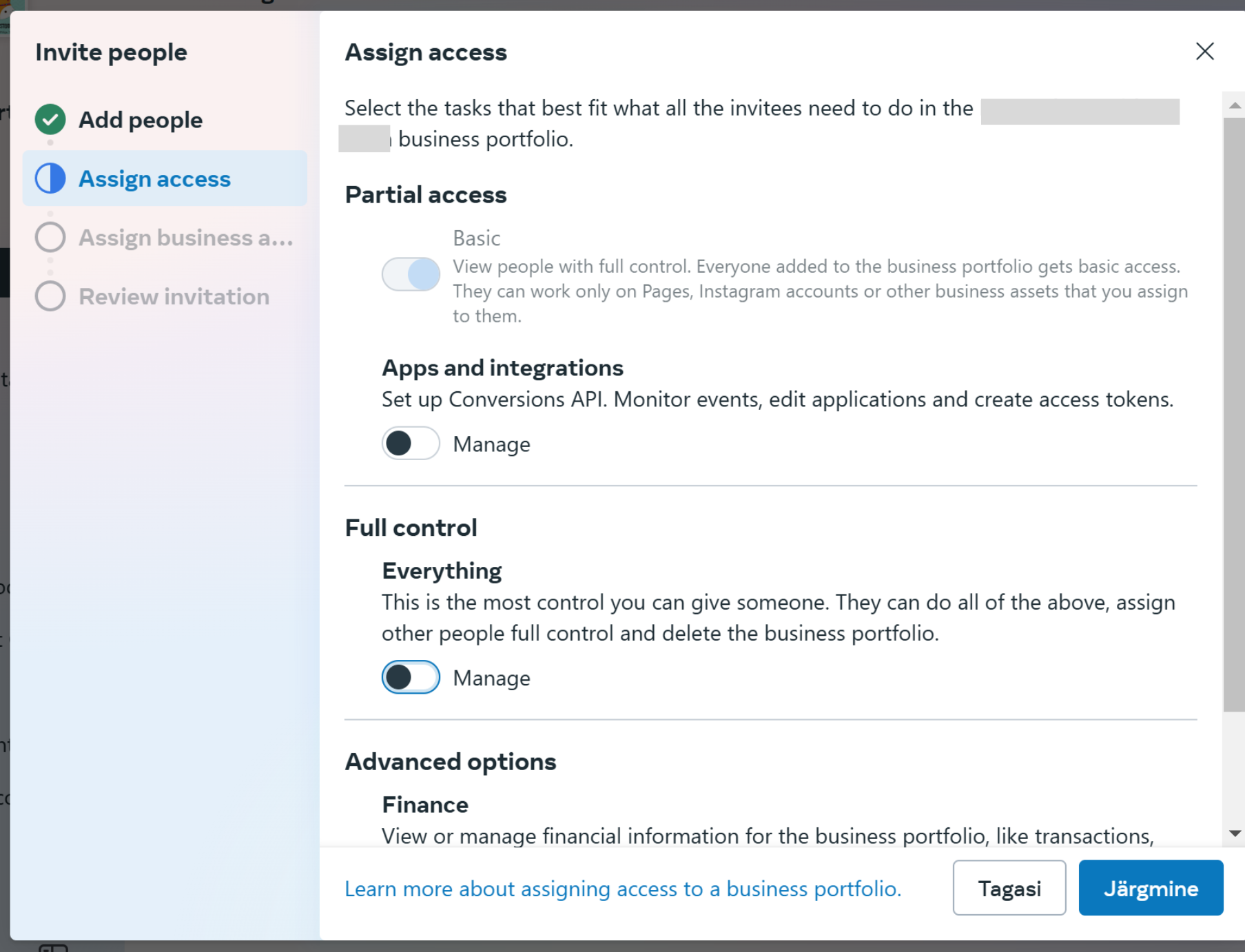 Valik, kas jagada ligipääsu inimesele isikuliselt või lisada teise Business Manageri konto partneriks, sõltub ligipääsu eesmärgist ja töökorraldusest.